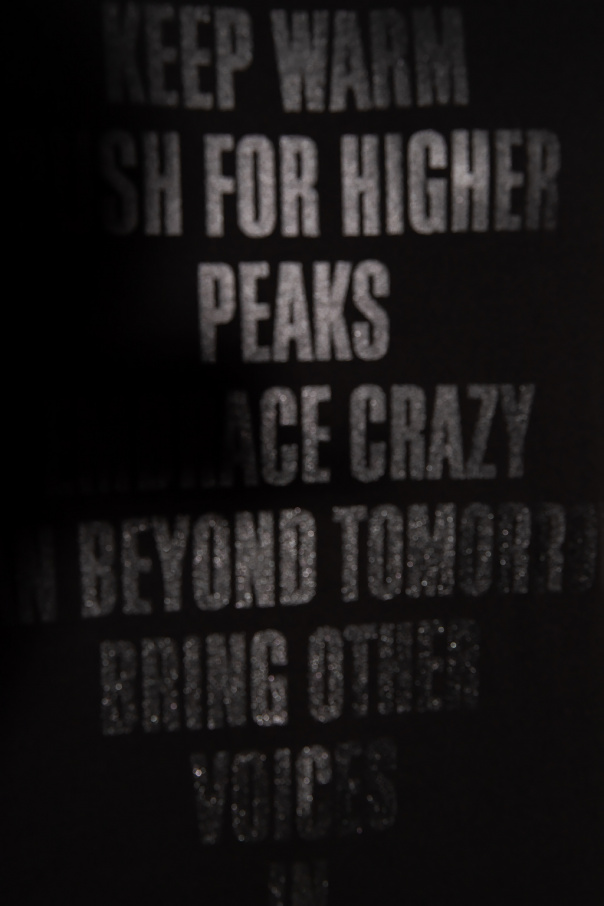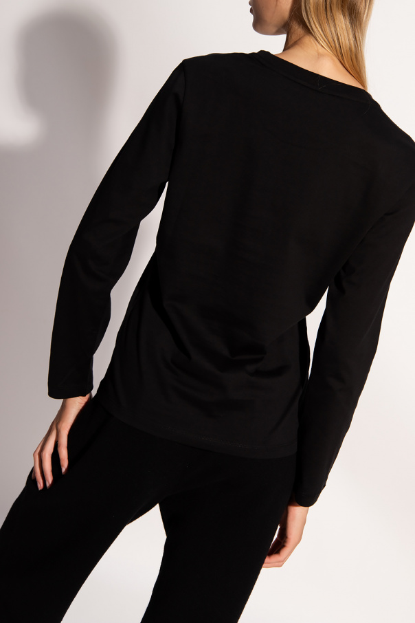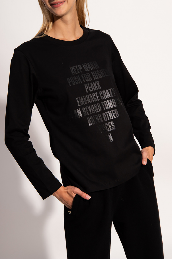Black crewneck T-shirt from Moncler. Made of cotton, this garment is enriched by a shiny black lettering, logo print and ribbed trims at the neck, hem and cuffs.