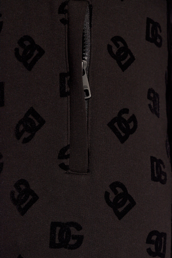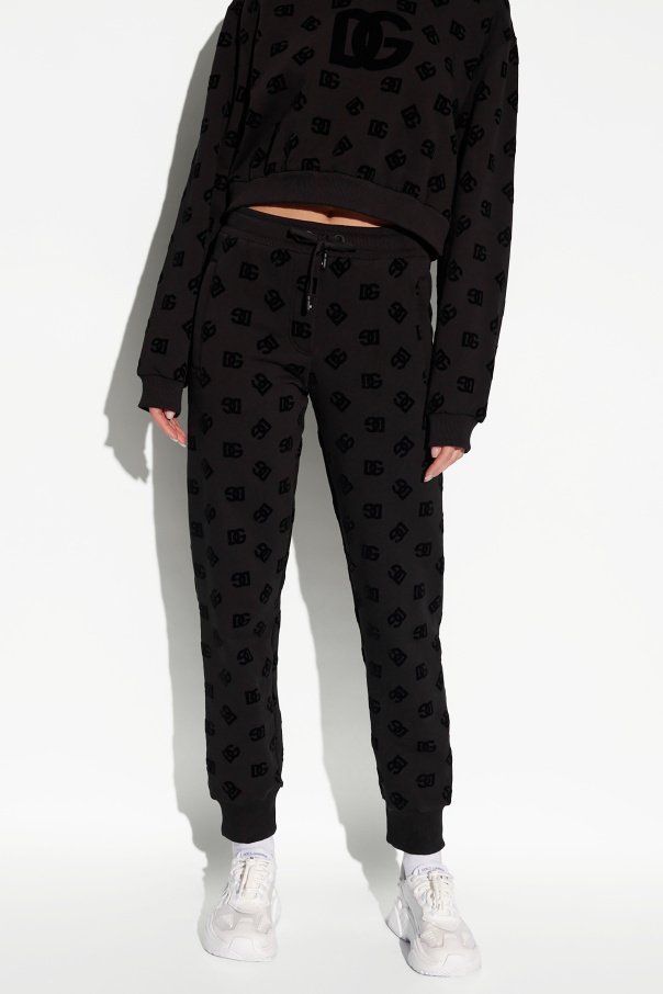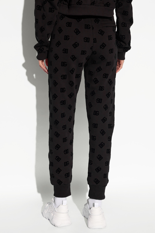 Black sweatpants from Dolce & Gabbana. Made of cotton, this pair features an elastic drawstring waistband, monogram pattern with a velvet finish, three zip pockets and ribbed cuffs.