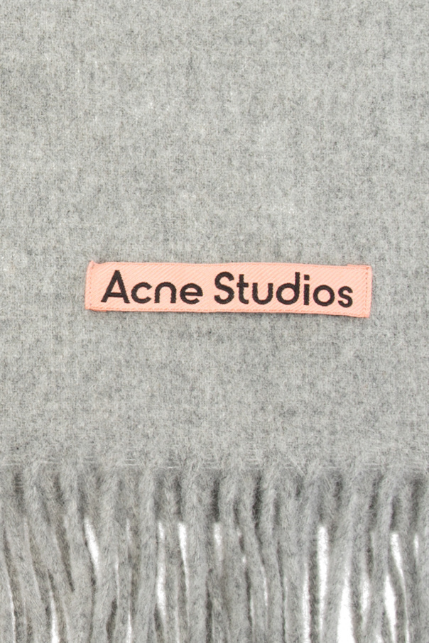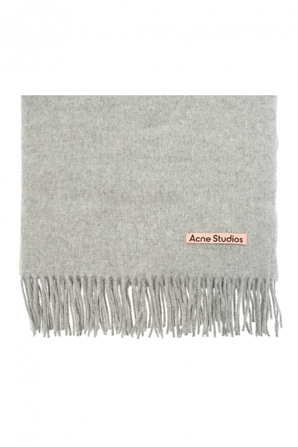 Grey scarf from Acne Studios. Crafted from wool, this item showcases a pink and black logo patch and fringe detailing.