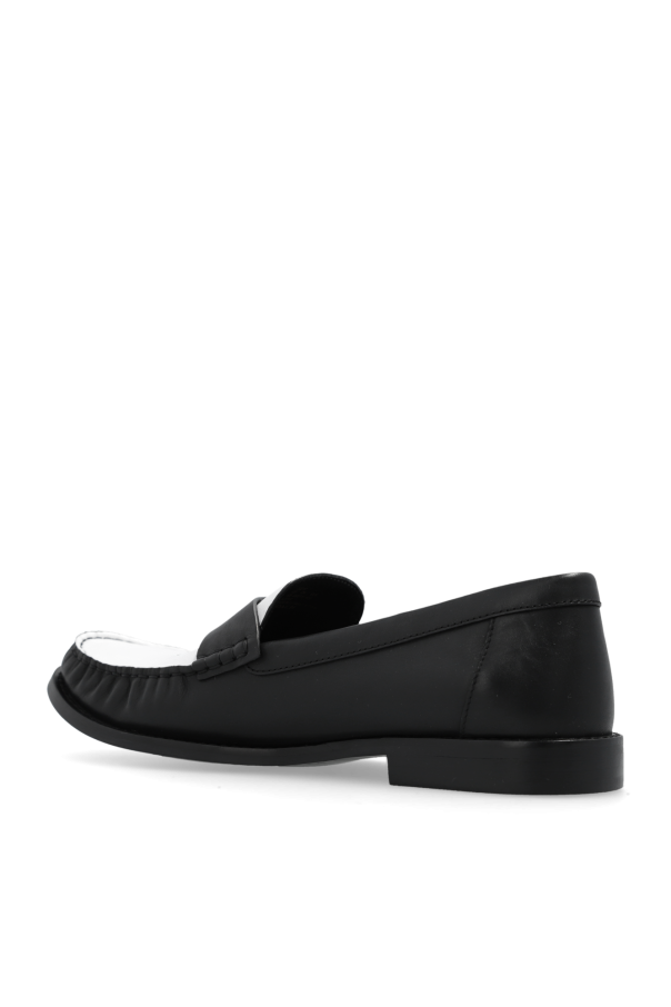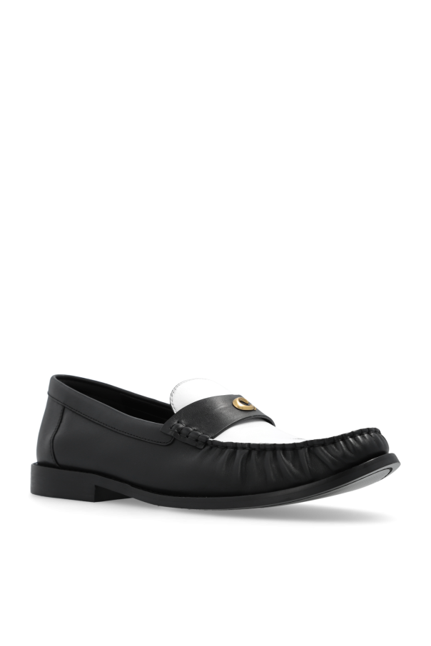 Black and white ‘Jolene’ loafers from Coach. Made of leather, this pair sits on a black rubber sole and is decorated with a gold-tone logo detail.