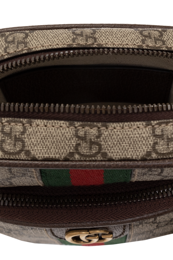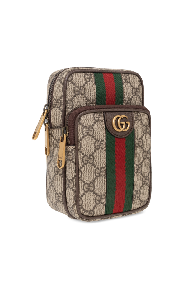 Beige and brown ‘Ophidia Mini’ shoulder bag from Gucci. Crafted from ‘GG Supreme’ canvas and trimmed with calf leather, this design secures with a two-way zipper and showcases a stitched green and red ‘Web’ stripe on the front. It is complete with an adjustable shoulder strap, ‘Double G’ logo hardware accompanied with a zip pocket on the front, antiqued gold-tone metal elements and one internal compartment with a card slot.