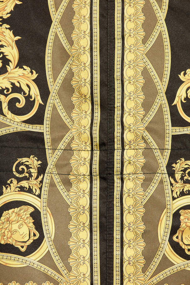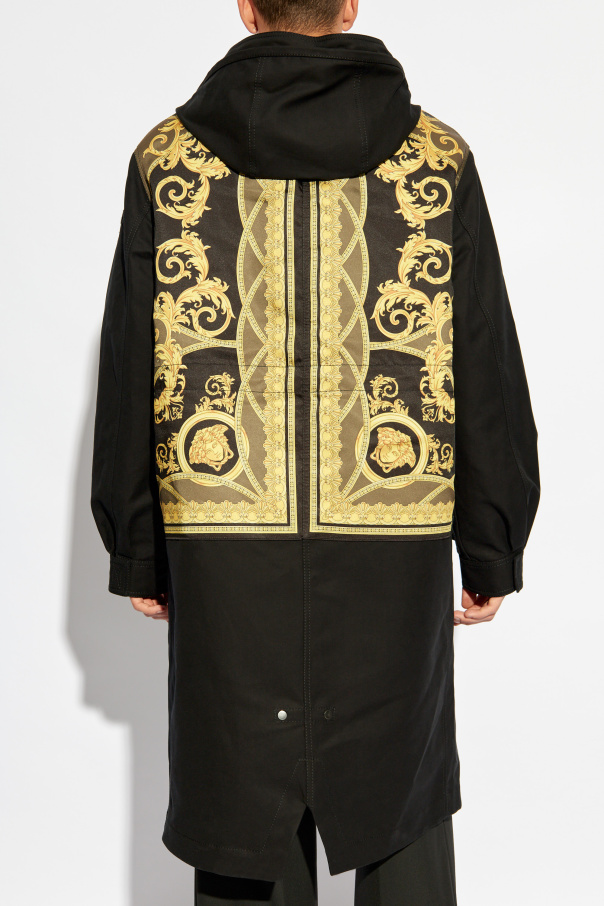 Parka from La Coupe des Dieux is a unique piece of men's wardrobe, originating from an exclusive collection by renowned designer, Versace. Founded in 1978 by Gianni Versace, this brand has become synonymous with luxury, innovation, and the highest level of Italian craftsmanship. This black parka, made from durable and luxurious fabrics such as cotton and polyester, combines elegance with functionality. The design includes an adjustable hood, a two-way zipper, and a wind flap fastened with snaps. The parka extends below the knees, offering additional protection against the cold. The product features four Velcro-fastened pockets—two large ones on the hips and two on the chest—that provide convenient storage for essential items. A rich, golden pattern on the back inspired by mythology and antiquity, along with intricate details, accentuates the exclusivity of this garment. Why should you buy this product? Unique design inspired by mythology and antiquity High-quality materials: cotton and polyester Practical and elegant solutions such as an adjustable hood and numerous pockets Precisely crafted details emphasizing the exclusivity of the product Renowned Versace brand symbolizing luxury and innovation