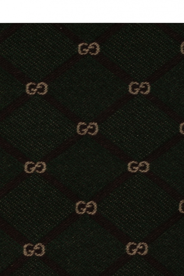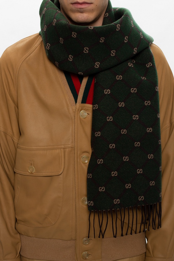 Brown and green scarf from Gucci. Crafted from a wool, this accessory is enriched with a beige logo embroidery and fringe edges.