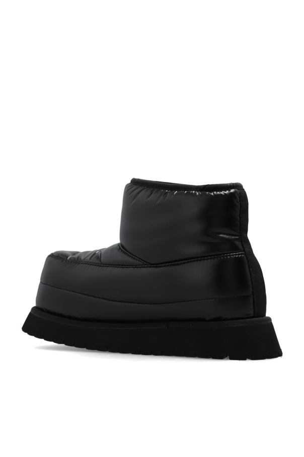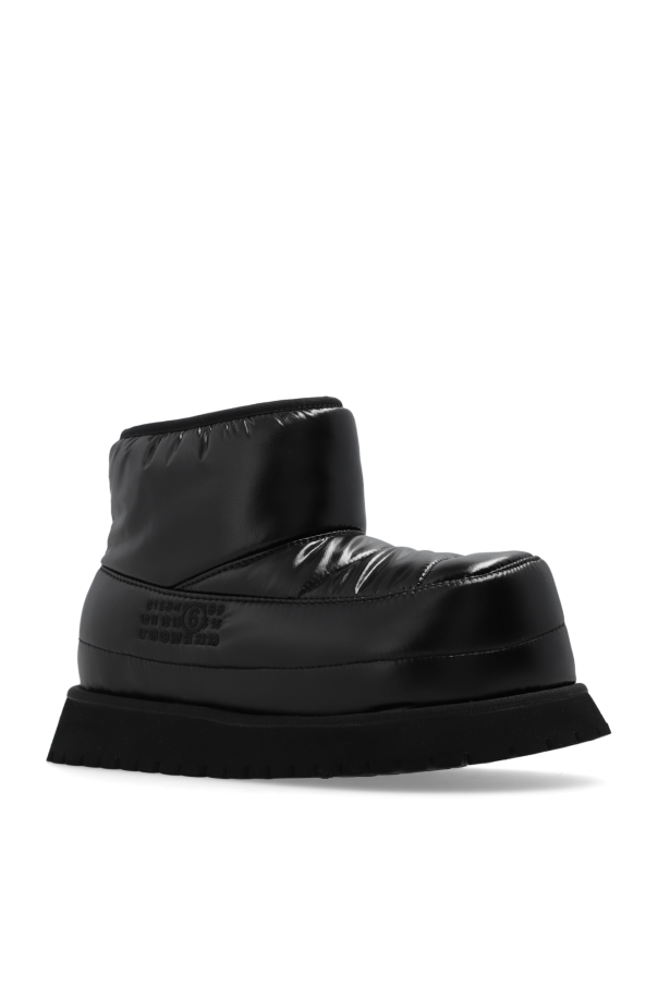Black apres-ski snow boots from MM6 Maison Margiela. Made from quilted material, this model sits on a black rubber platform sole and showcases embroidered detailing with the brand's logo.