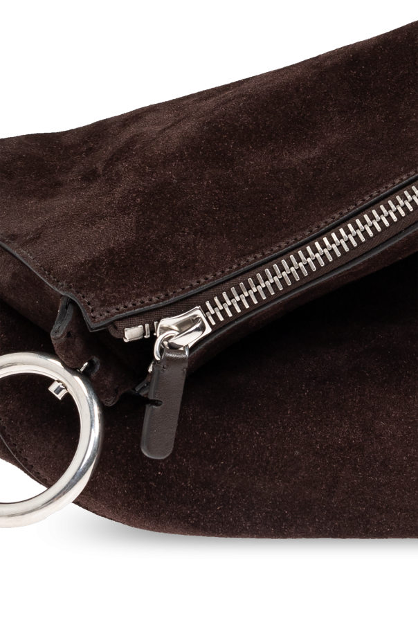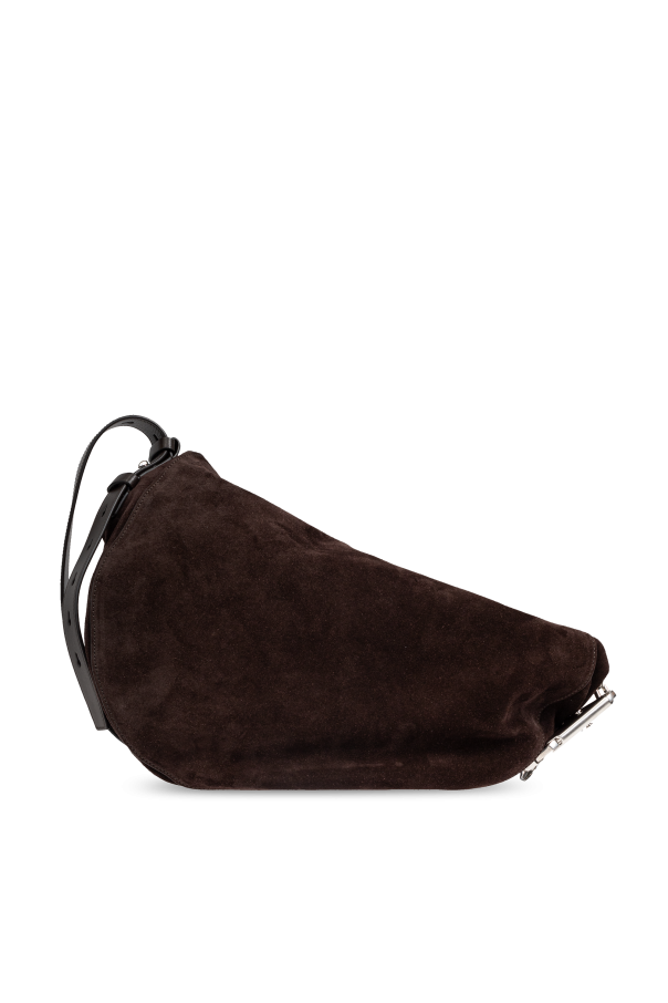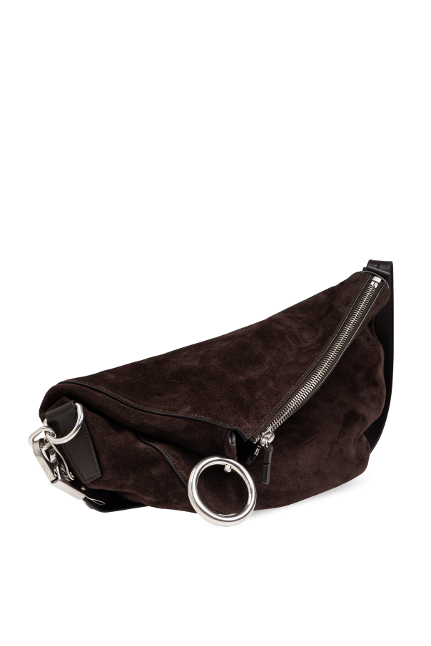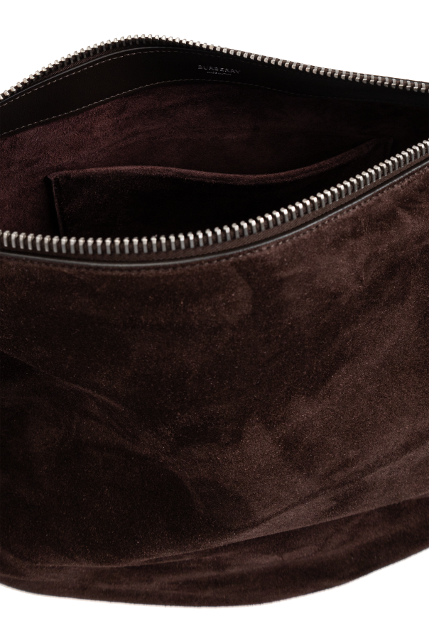 Introducing the Knight Shoulder Bag from the esteemed house of Burberry, an epitome of elegance and sophistication. Crafted for discerning women, this large shoulder bag is a testament to exquisite craftsmanship and timeless style. Meticulously constructed from soft, brown suede, the Knight Shoulder Bag showcases an asymmetrical, slightly triangular shape that exudes modernity and chic allure. The front of the bag is adorned with a silver-toned metal zipper, adding a touch of elegance and striking contrast to the rich brown suede. Noteworthy details include a large, silver-toned metal ring at the end of the zipper, serving as a decorative and functional element, along with silver-toned hardware that accentuates the bag's luxurious character. The interior is lined with a matching brown material, either suede or velvet, featuring a compartment and a slip pocket for enhanced functionality. The adjustable shoulder strap ensures a personalized fit, making this bag as practical as it is stylish. The subtle designer logo embossed within the bag confirms its exclusive heritage. Why Choose This Product? Exquisite craftsmanship from the renowned Burberry brand Luxurious and soft brown suede material Modern, asymmetrical design with elegant silver-toned hardware Functional interior with a compartment and slip pocket Adjustable shoulder strap for personalized comfort Subtle designer logo, affirming exclusivity