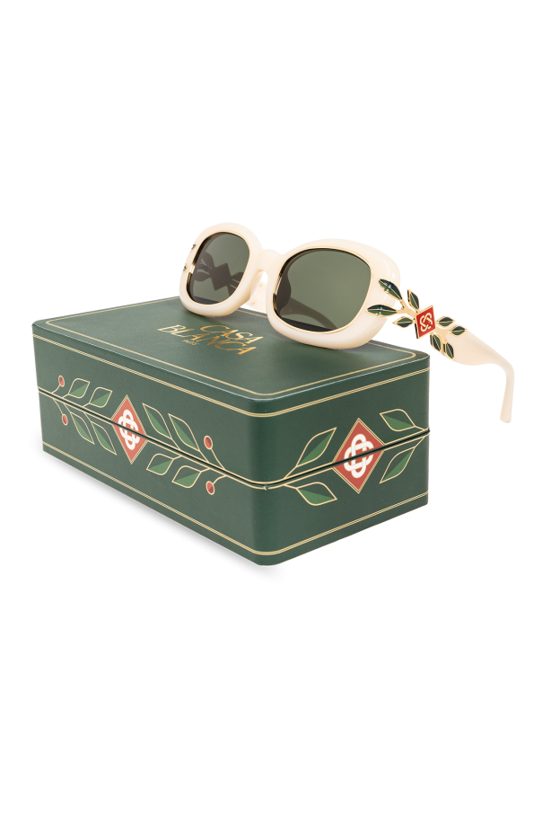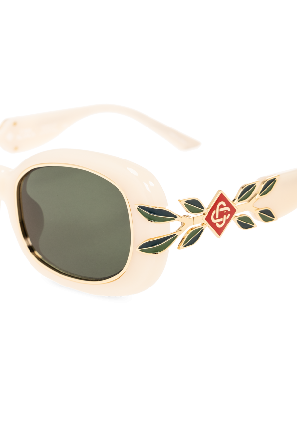 Cream sunglasses from Casablanca. This pair features a rectangular frame, multicolored logo details, gold-tone metal hardware and green lenses with 100% UV protection. Case included.