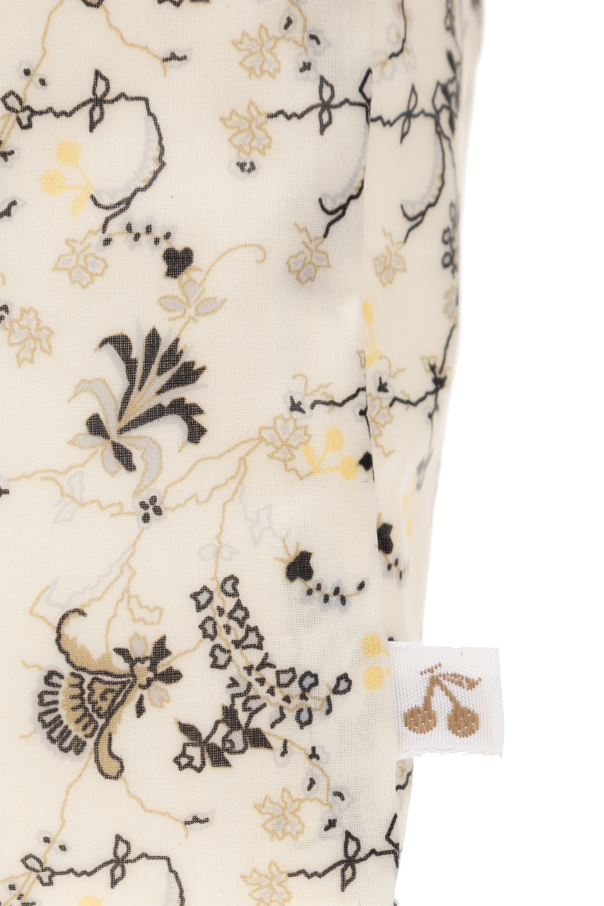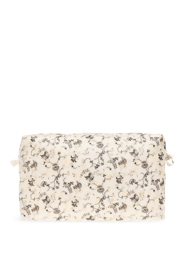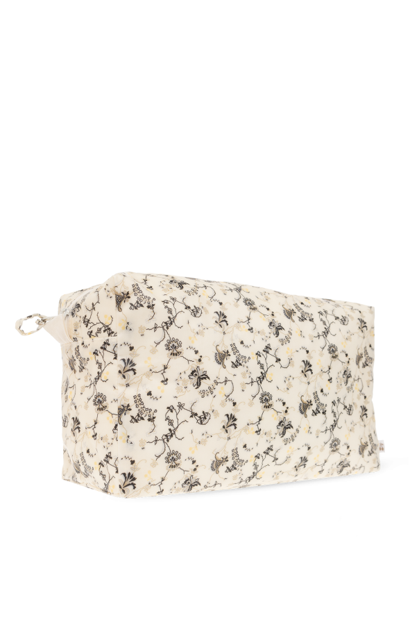 Cream wash bag from Bonpoint. Crafted from coated canvas, this design features a zip fastening, black, grey and yellow pattern, one internal compartment and cream metal hardware.
