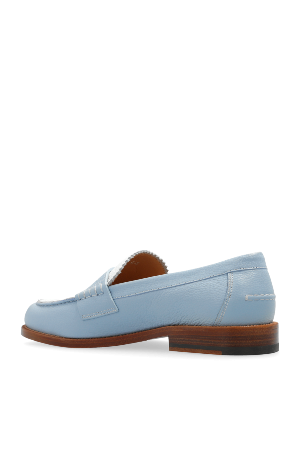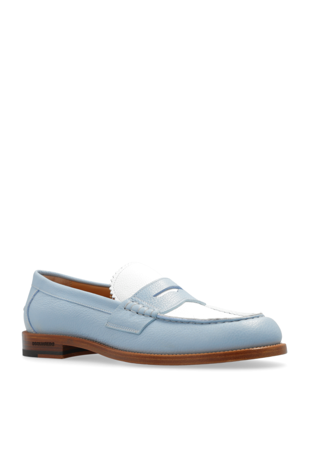 Blue and white loafers with a logo and brown leather sole from Dsquared2. Made of leather.