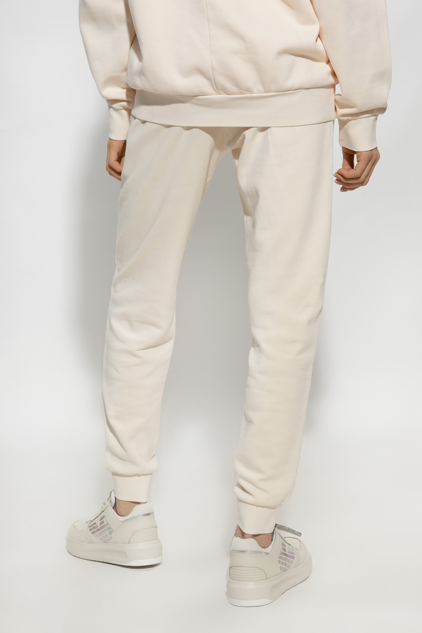 Cream sweatpants from EA7 Emporio Armani. Crafted from cotton, this pair features a drawstring waistband, logo print, two front pockets and ribbed edges.