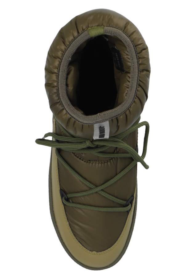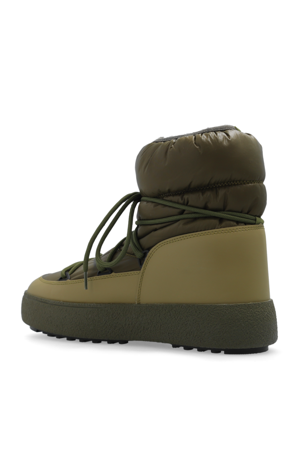 Dark green ‘Mtrack Low’ snow boots from Moon Boot. Made of waterproof fabric, this lace-up model sits on a dark green and black thermoplastic rubber tread sole and features an elasticized collar and logo detailing.