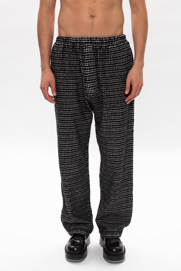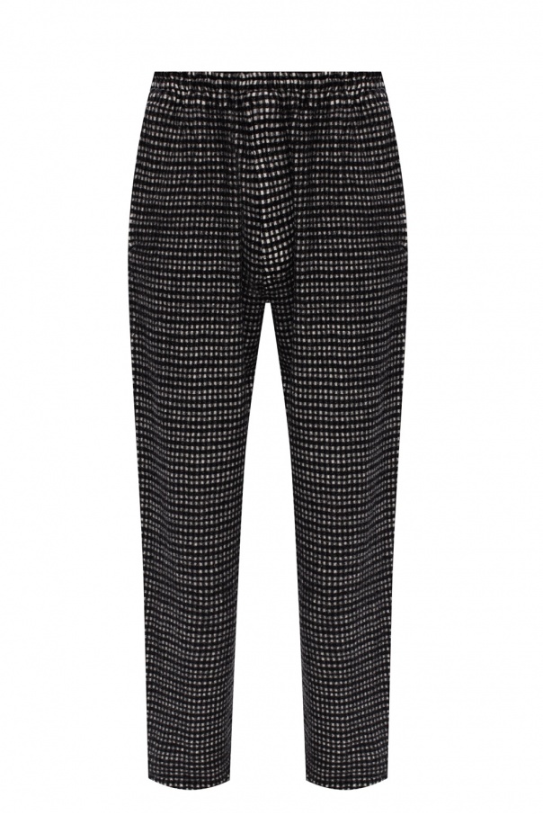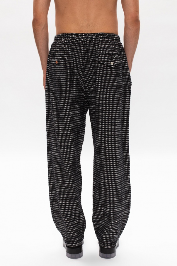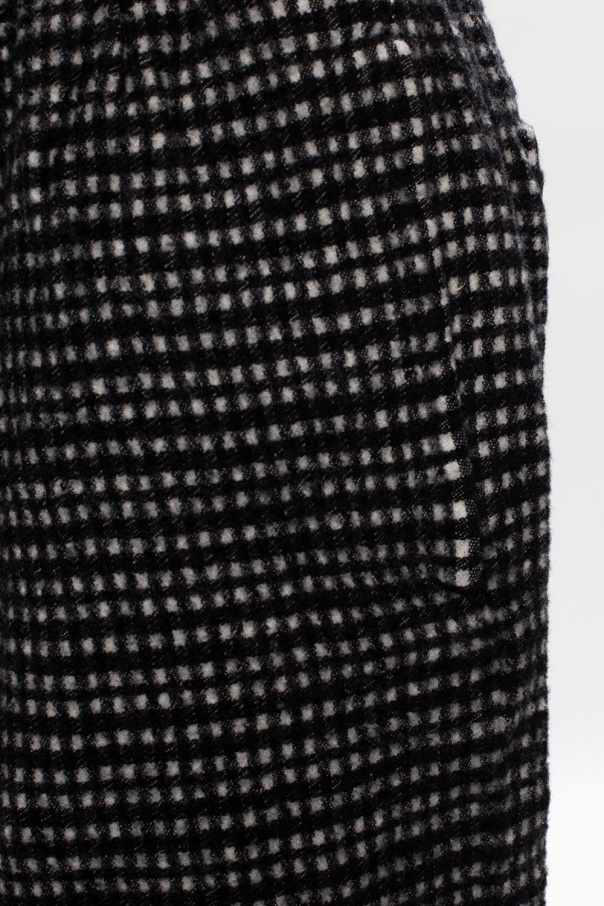 Black and white trousers from Undercover. Crafted from wool, this wide leg design features a drawstring waist, check pattern, two slip pockets on the front and a buttoned flap pocket at the back.