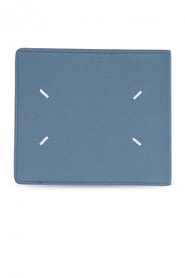 Blueish grey bi-fold wallet from Maison Margiela. Made of calf leather, this item showcases the brand's signature contrasting white four-stitches moniker at the back and two bill compartments, two slip pockets and four card slots inside.