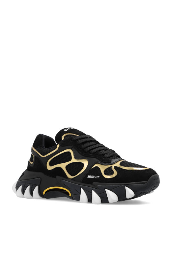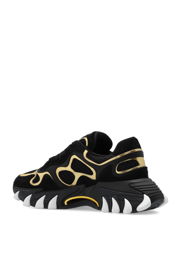 Black and gold-tone ‘B-East’ sneakers from Balmain. Crafted from leather and mesh and suede overlays, this lace-up model sits on a decorative black and white rubber sole and showcases the brand's logo.