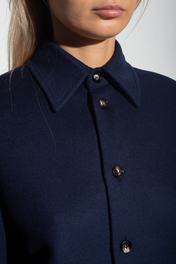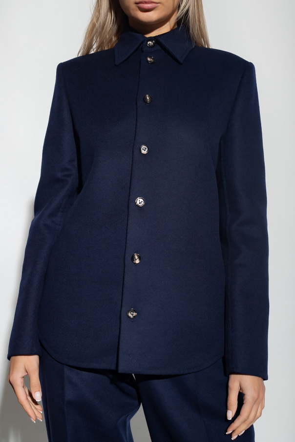 Navy shirt jacket from Bottega Veneta. Made of wool, this garment features buttoned with a partly concealed placket, triangle stitching detail at the back and long sleeves with buttoned cuffs.