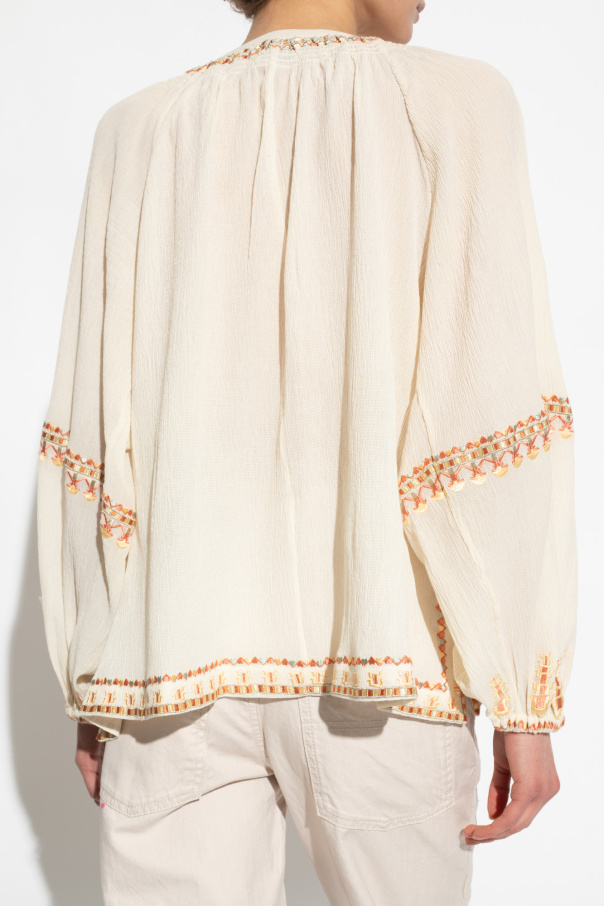 Cream ‘Clive’ shirt from Isabel Marant. Crafted from a cotton and silk blend, this design features geometric stitches in orange, yellow and green, tie neck and long puff sleeves with elasticated cuffs.
