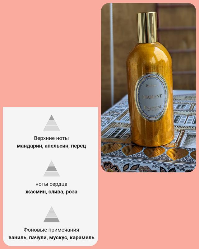 Diamant Fragonard - это аромат для женщин, принадлежит к группе ароматов Восточные Цветочные. Diamant был выпущен в 2006 году. Верхние ноты: Перец, Апельсин и Мандарин; ноты сердца: Жасмин, Слива и Роза; ноты базы: Пачули, карамель, Ваниль и Мускус.
