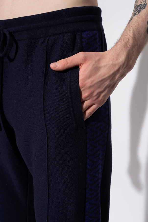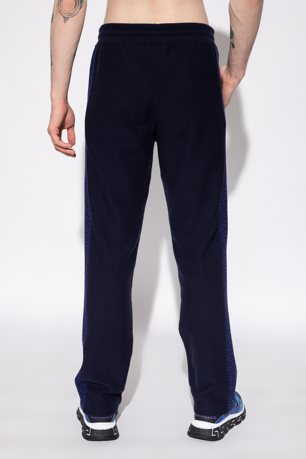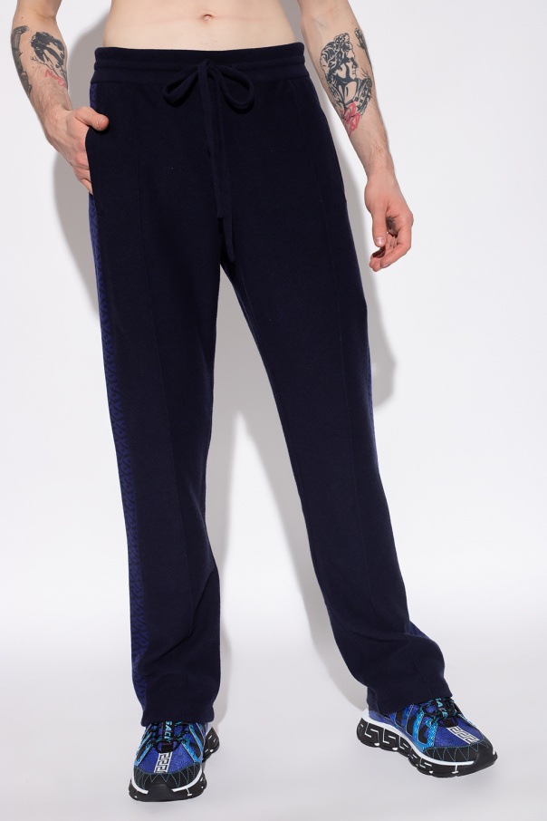 Navy sweatpants from Versace. Made of a wool and cashmere blend, this straight leg design features a drawstring waist, side stripes with the iconic La Greca motif and two slip pockets.