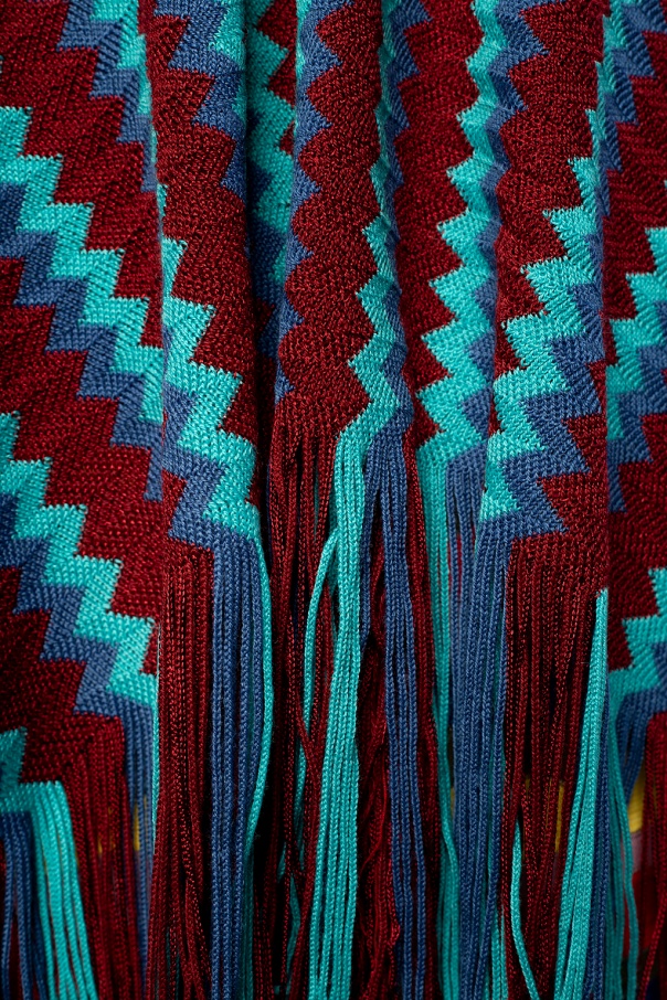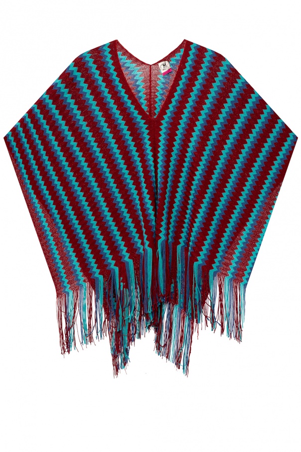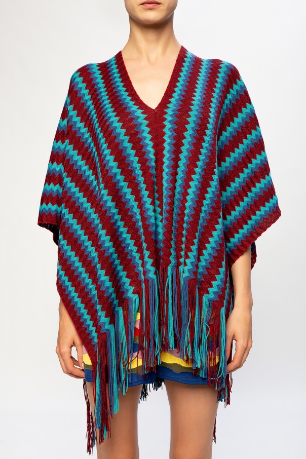 Maroon, blue and green poncho from M Missoni. This design comes enriched with a geometric pattern and fringes.