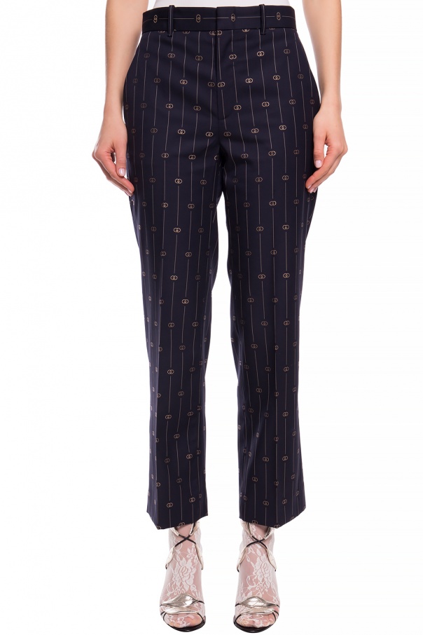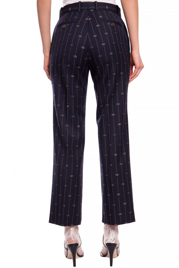 Navy creased trousers from Gucci. Made of wool and silk. Zip, hook and button fastening. Decorated with an embroidered logo pattern in gold-tone. Two slip pockets and two button pockets on the front. Straight legs.