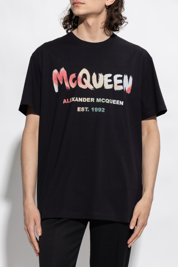 Black T-shirt from Alexander McQueen. Made of cotton, this short sleeve design features a multicolored logo print and ribbed crew neck.
