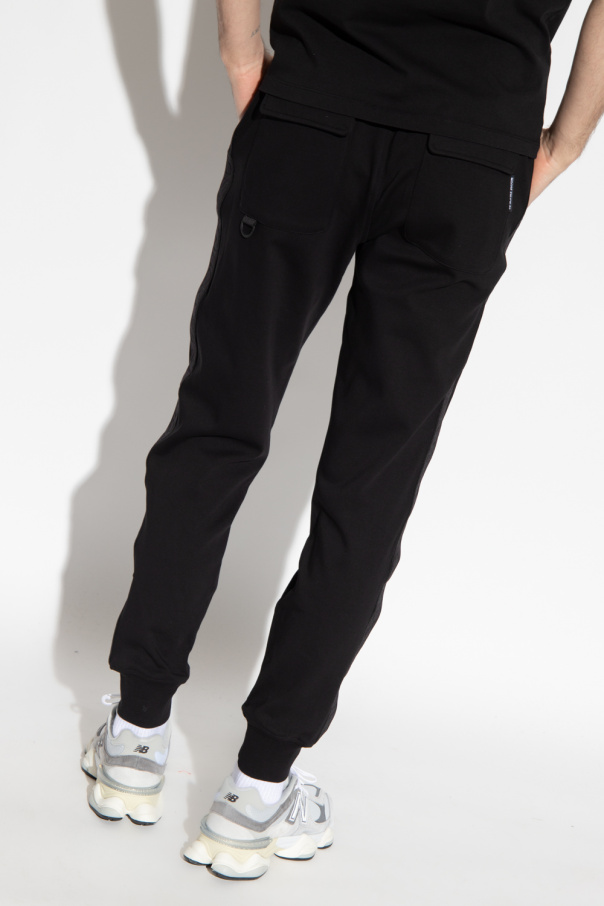 Black sweatpants from Moose Knuckles. Crafted from cotton, this pair features a drawstring waist, two front zip pockets, two back flapped pockets, elasticated cuffs, gold-tone and black logo patches and branded panels on the sides.