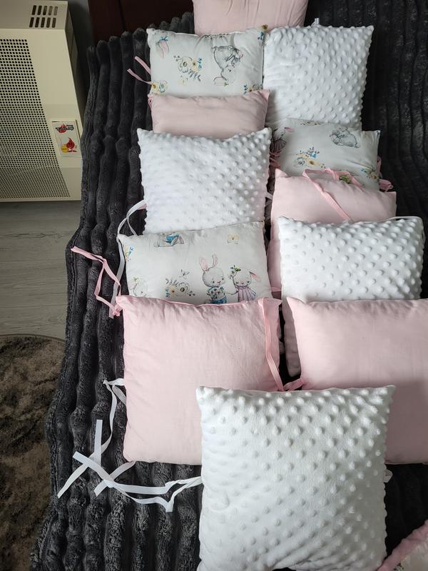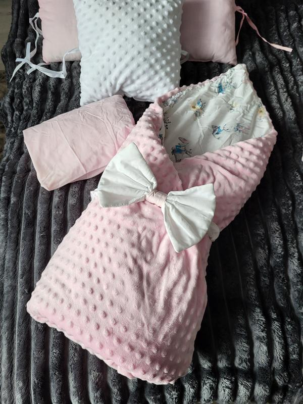 Бортики в дитяче ліжечко для дівчинки, 12 подушечок на завязках, простинь на резинці, ковдра-конверт на виписку, синтепон виймається