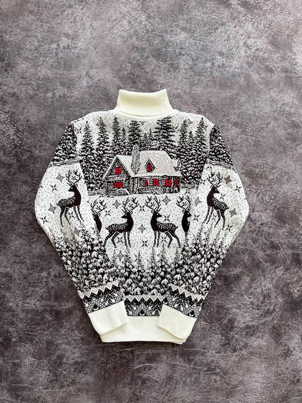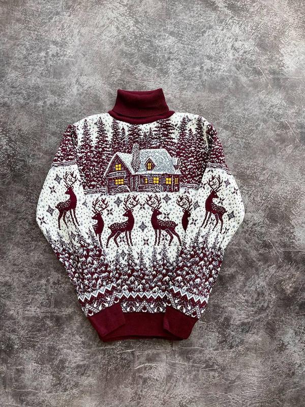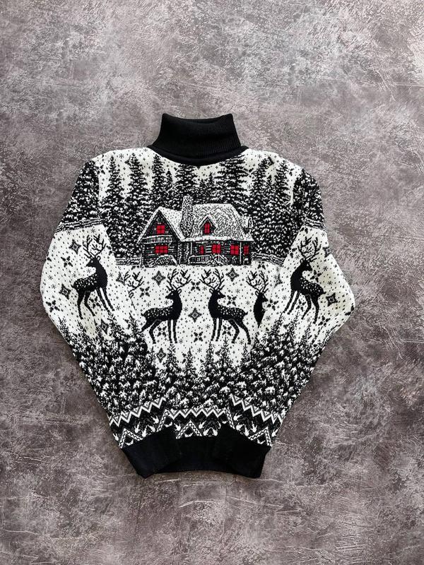 Мужской зимний новогодний свитер синий с оленями под горло шерстяной Кофта