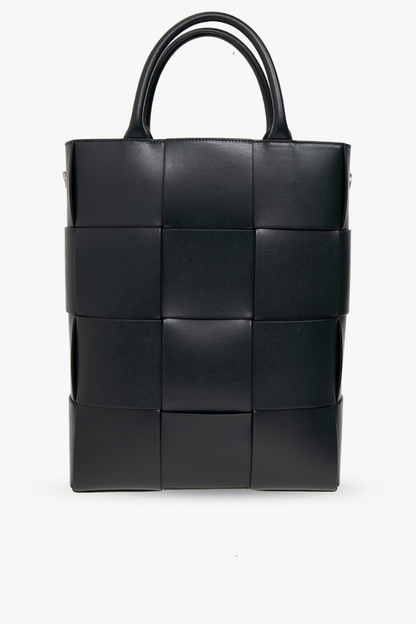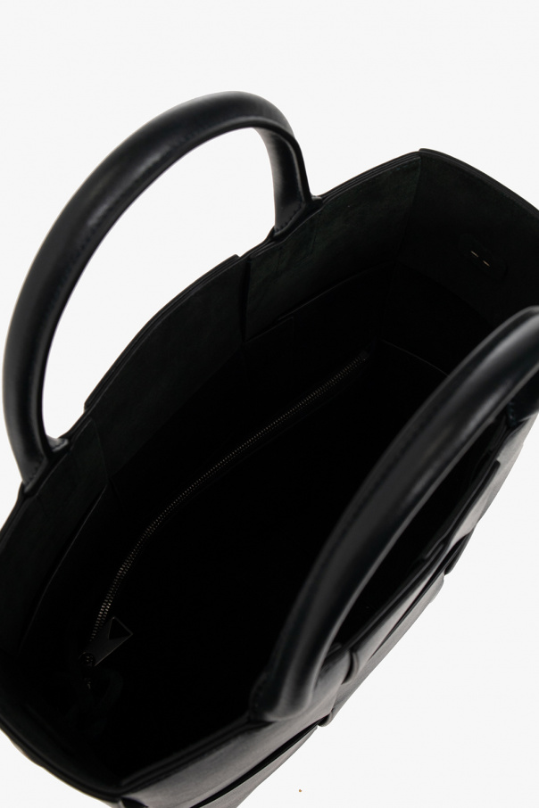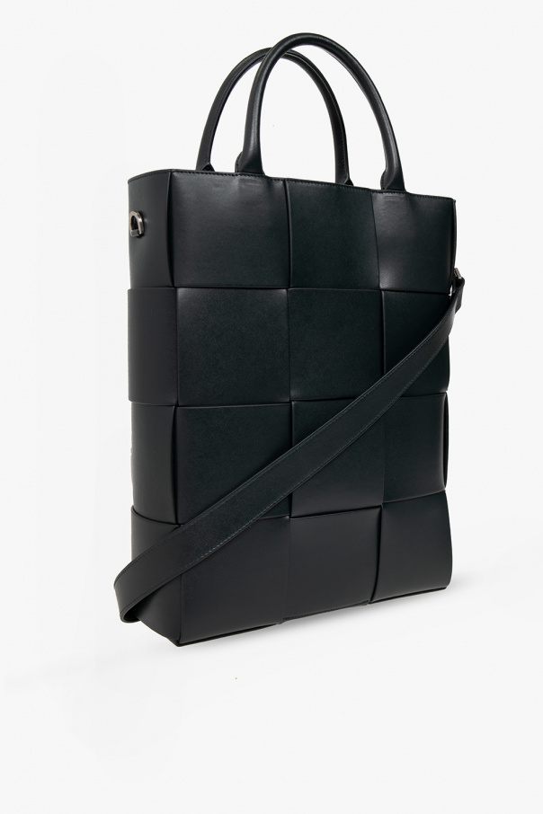 Dark green ‘Arco Medium’ shopper bag from Bottega Veneta. Crafted from calf leather accentuated with the brand's signature Intreccio weave, this design features two half-round handles, a detachable and adjustable shoulder strap, silver-tone metal hardware and one internal compartment with a detachable suede zip pouch with an embossed logo.