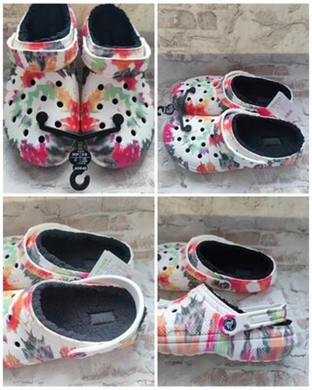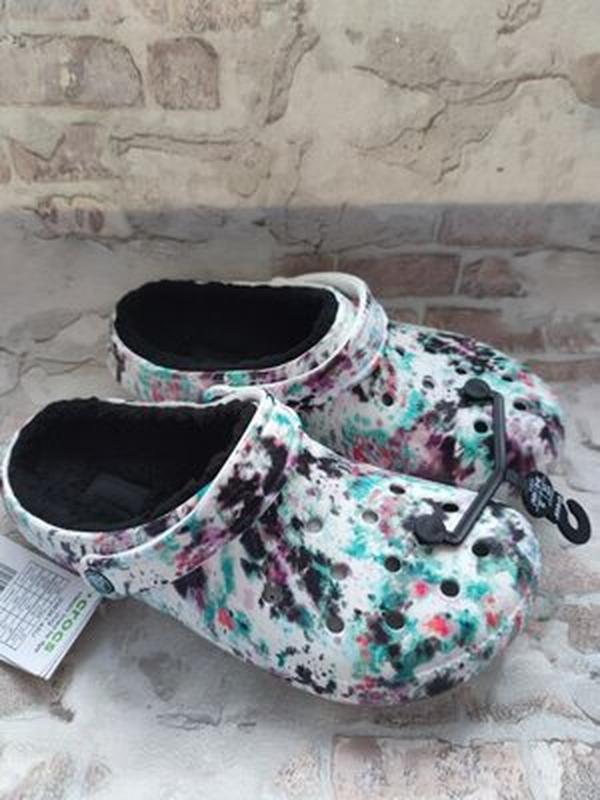 Лёгкие, тёплые и комфортные оригинальные классические кроксы с подкладкой и забавным ярким принтом тай-дай