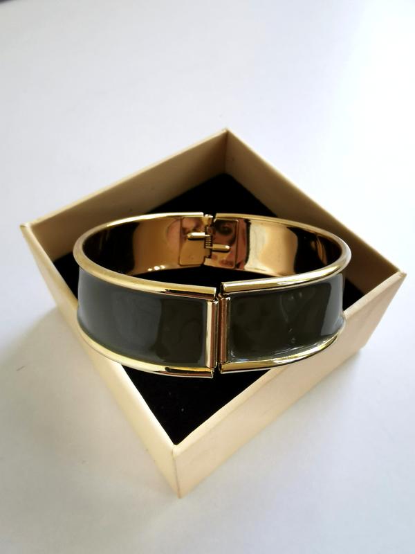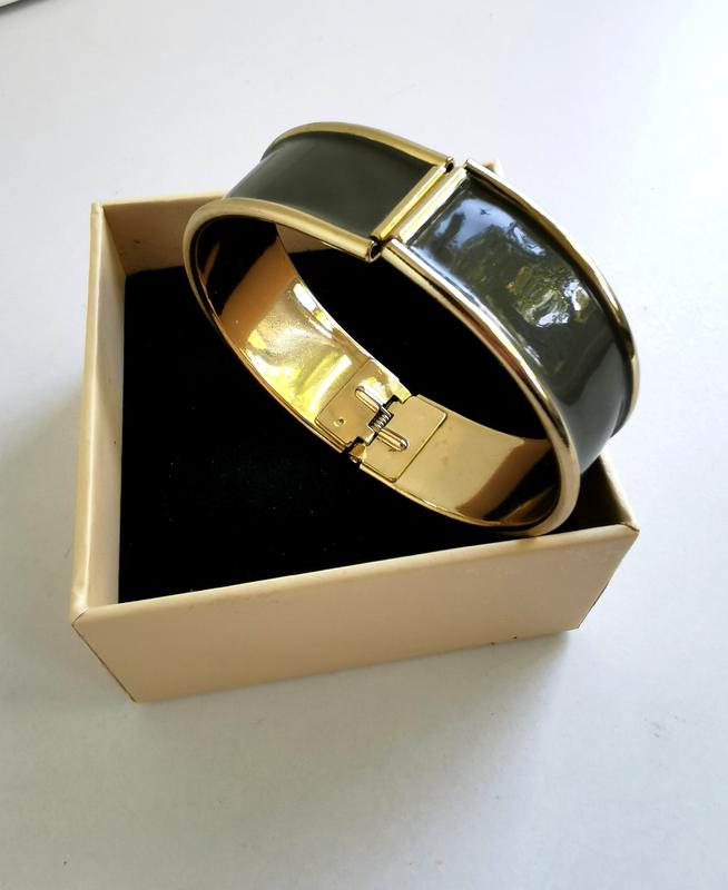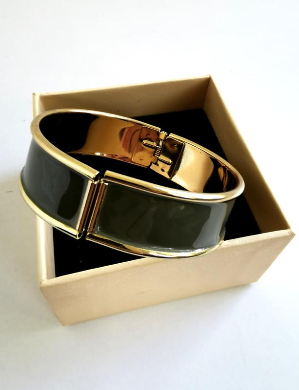 Очень красивый винтажный браслет. Выполнен из золотистого металла. Лицевая сторона покрыта эмалью темно-серого цвета. Браслет на пружинной застежке. Очень красиво, элегантно смотрится на руке. Стильное украшение для любой модницы.