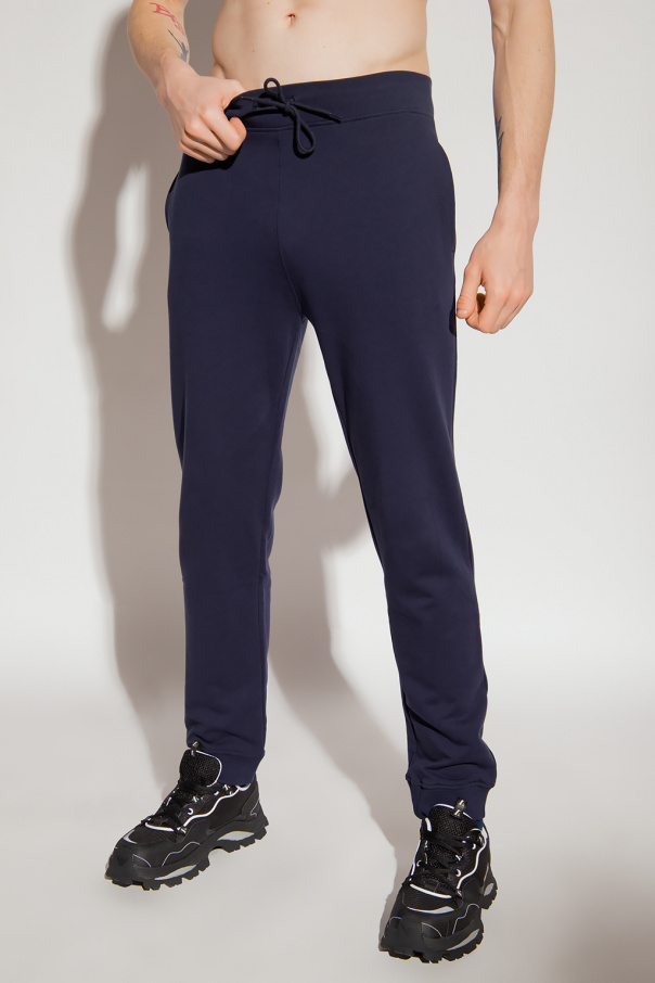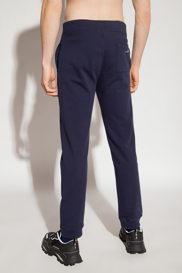 Navy sweatpants from A.P.C. Made of cotton, this pair features an elastic waistband with drawstrings, three slip pockets, white logo print at the back and ribbed cuffs.