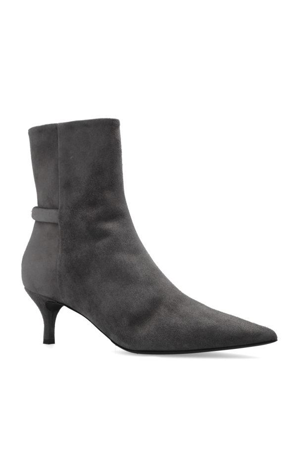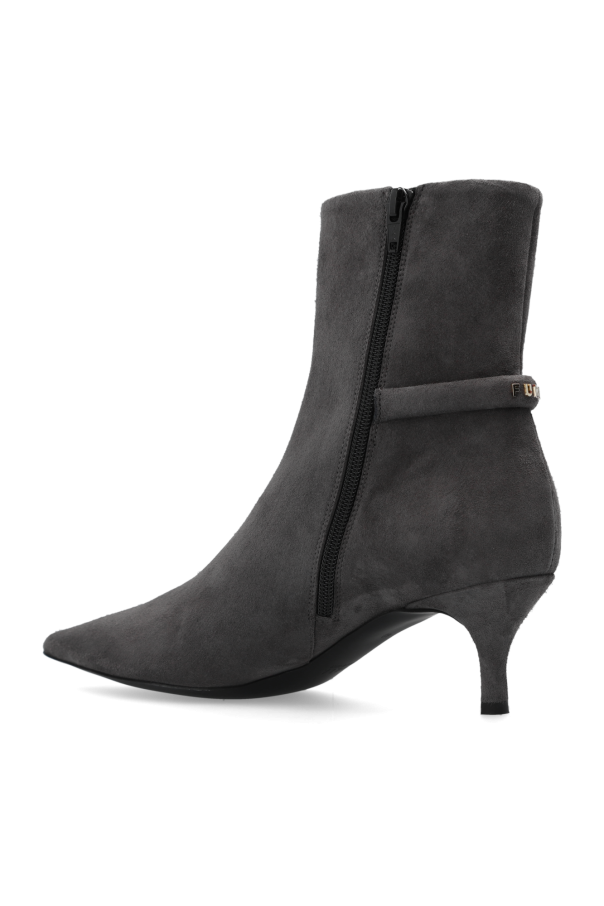 Grey ‘Core’ heeled ankle boots from Furla. Made from suede with a pointed toe silhouette, this model sits on a black rubber sole and features a side zipper and a back strap accentuated with silver-tone logo hardware.
