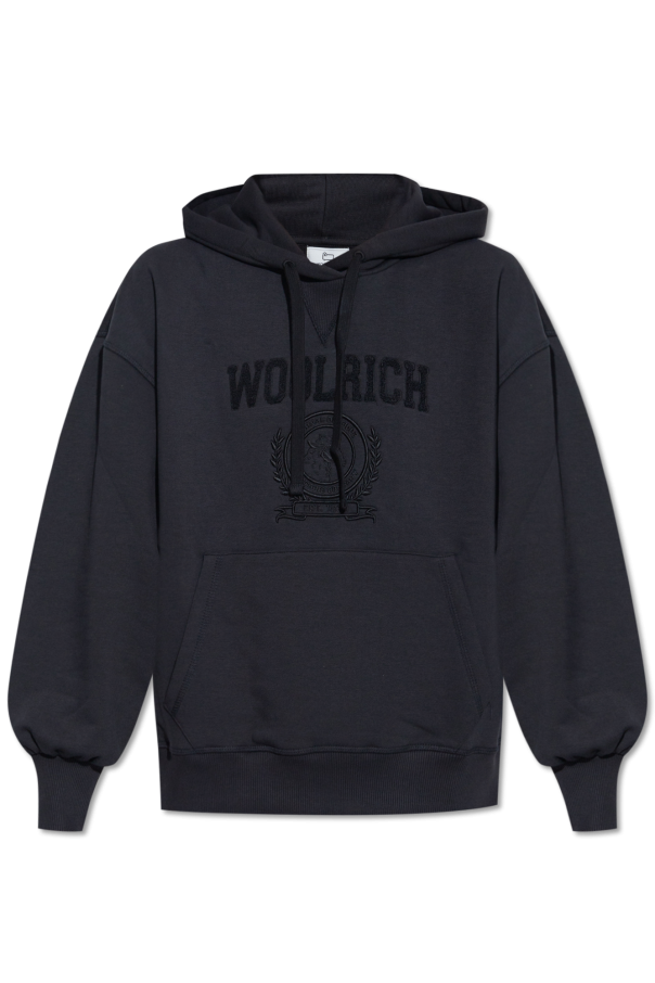 Black hoodie from Woolrich. Made of cotton, this design is decorated with an embroidered logo on the front and has a drawstring hood, slip pocket, long sleeves and ribbed edges.