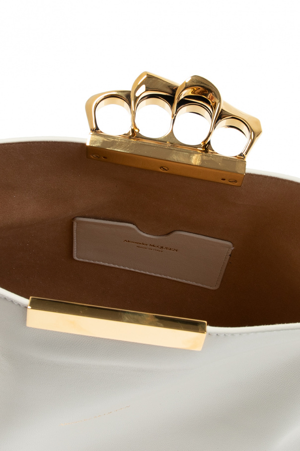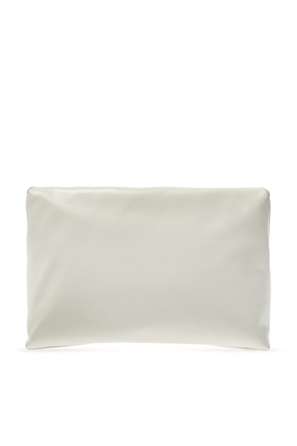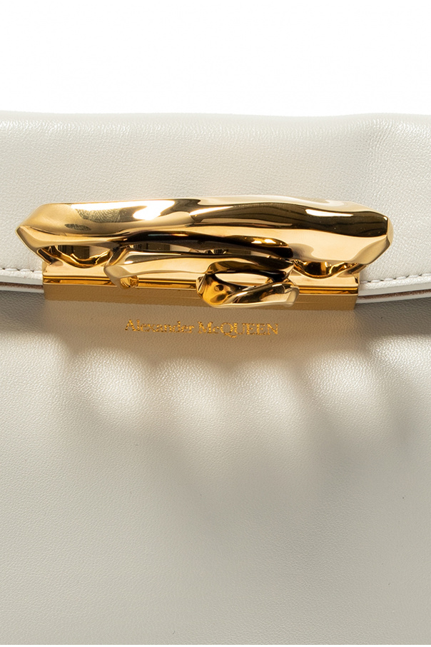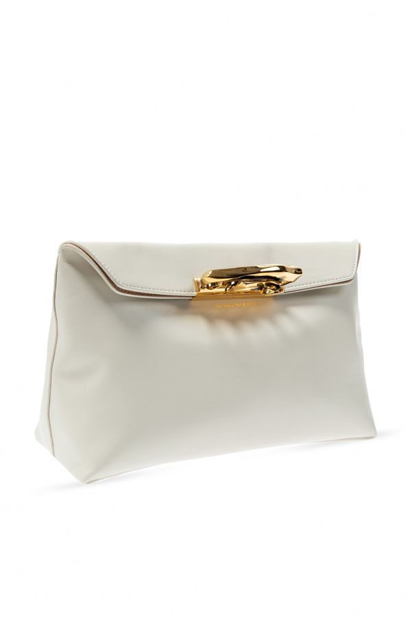 White clutch from Alexander McQueen. Crafted from leather, this design features a magnetic snap, gold-tone logo print, decorative appliqué and one internal compartment with one card slot.