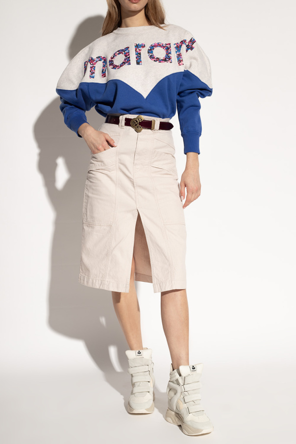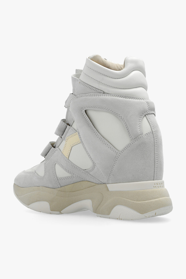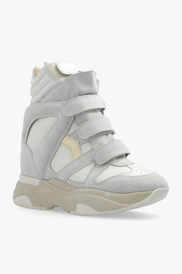 Cream ‘Balskee’ wedge boots from Isabel Marant. Crafted from suede and leather, this pair features velcro fastening, logo patch on the tongue, perforations on the front and beige rubber sole.