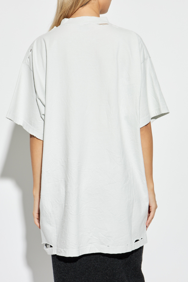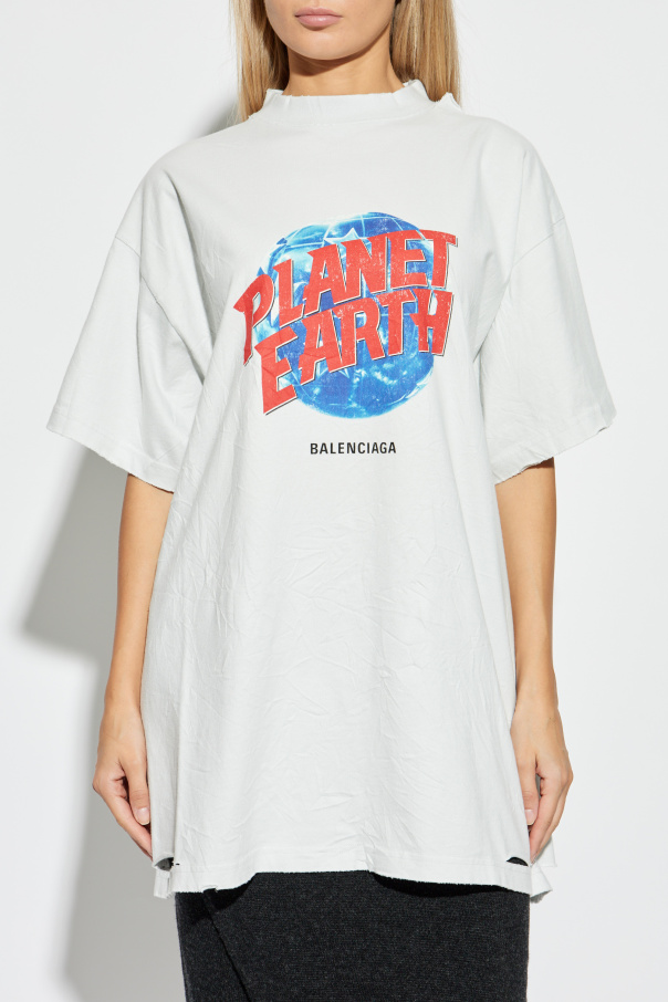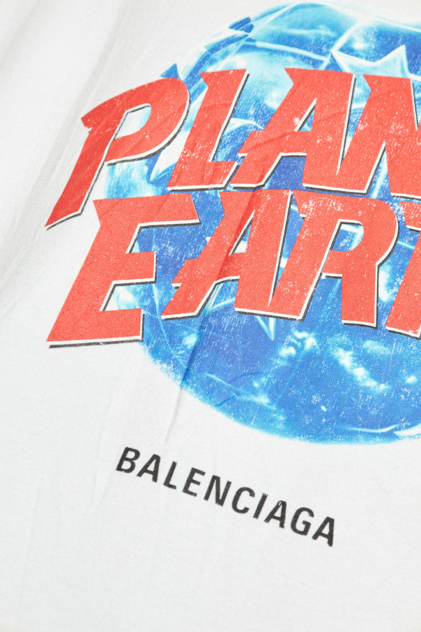 Introducing the Balenciaga Vintage Effect T-shirt, an exquisite piece from the renowned fashion house Balenciaga. This unisex T-shirt epitomizes the perfect blend of comfort and style, crafted from the finest cotton material. The dominant white hue provides a pristine backdrop for the striking graphic elements adorning the front. The T-shirt features a compelling large print of a blue planet Earth, accompanied by the bold red inscription "PLANET EARTH," and the iconic "BALENCIAGA" branding in black. These details not only enhance the visual appeal but also underscore the brand's commitment to impactful design. Designed with an oversized, relaxed fit, this T-shirt boasts short, wide sleeves and a length that falls below the hips, ensuring a casual yet sophisticated silhouette. The round neckline adds a classic touch, while the subtly distressed material and print lend an authentic vintage charm. Why Choose This Product? Exquisite Design: Featuring a unique graphic print that stands out. Premium Material: Made from 100% high-quality cotton for ultimate comfort. Versatile Style: Unisex, oversized fit suitable for various occasions. Iconic Branding: Proudly displays the Balenciaga name. Vintage Appeal: Distressed effect for a timeless look.