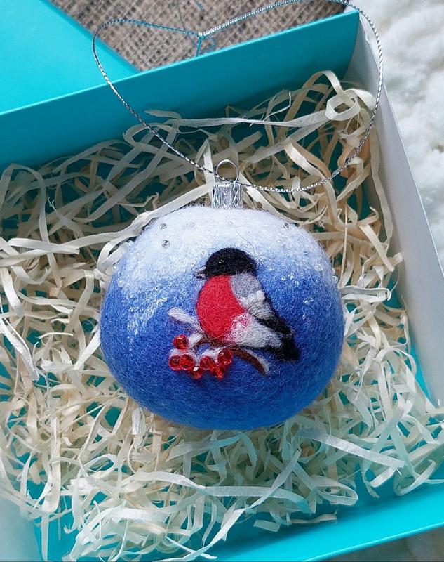 Этим волшебным елочным шаром "Снегирь" диаметром 6 см дышит тепло ручной работы. Игрушка изготовлена из нежнейшей мериносовой шерсти в технике валяния, расшита чешским бисером и переливается волокнами вискозы, напоминая блестящий снег.