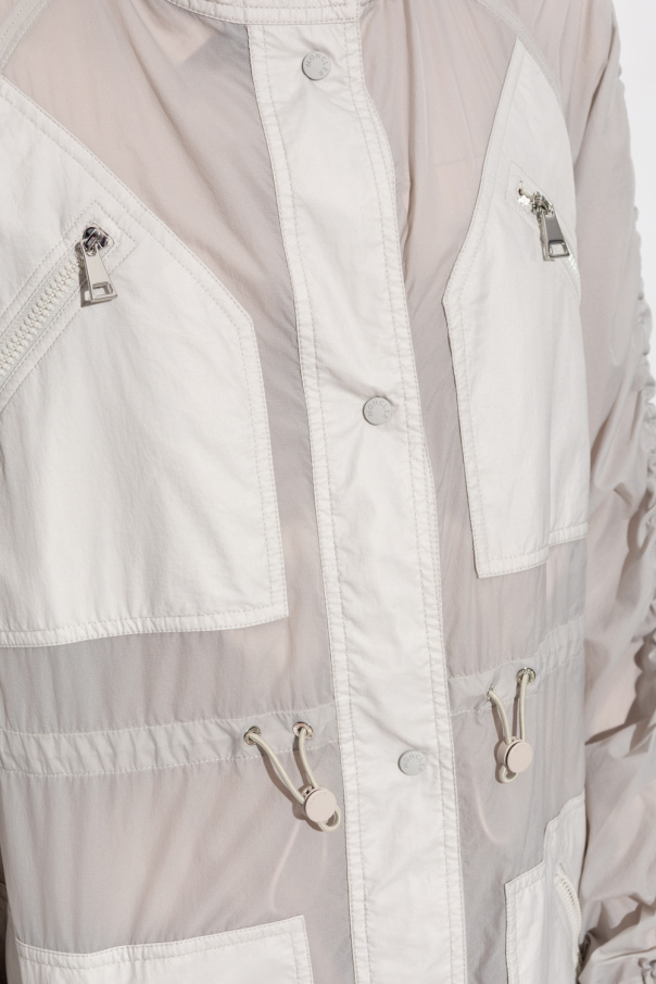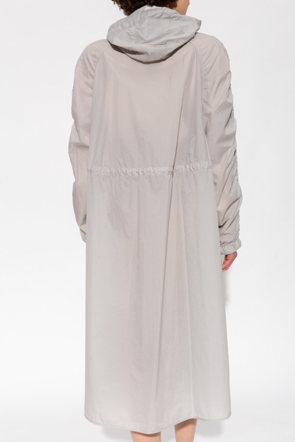 Grey coat from Moncler. Fastened with snaps, this design features a drawstring waist, long sleeves and four zip pockets.