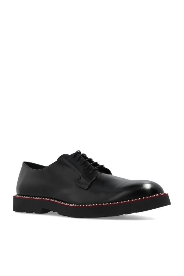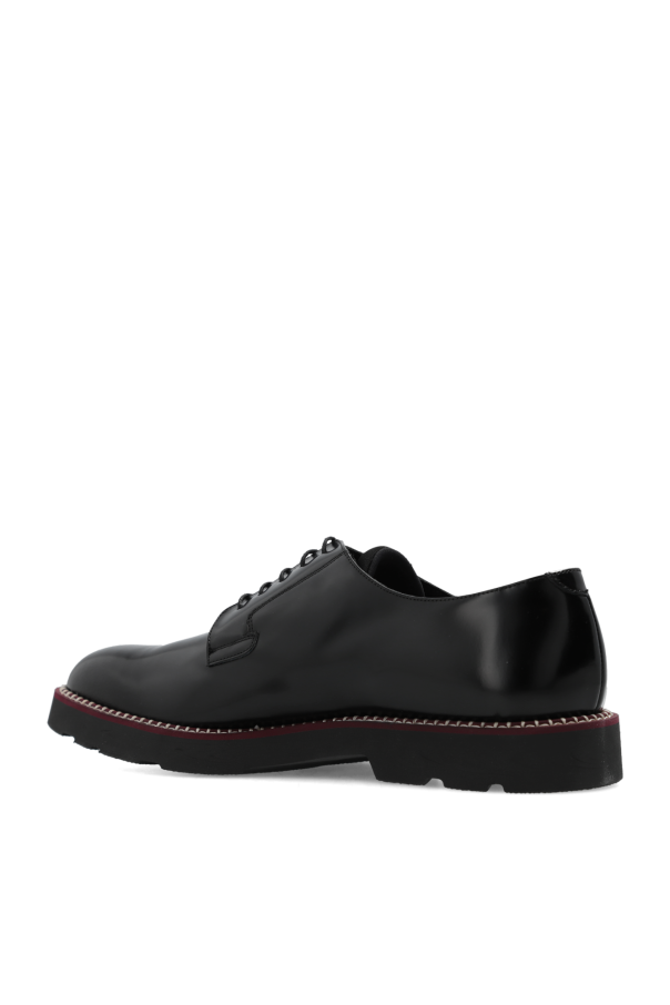 Black ‘Ras’ shoes from Paul Smith. Made from smooth leather, this lace-up model sits on a black and maroon rubber sole accentuated with white stitching details and features a tactile logo on the tongue. Swappable laces included.