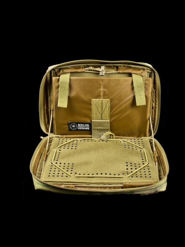 - Задняя стенка оснащена стропами и системой Molle для крепления на плитоноску.