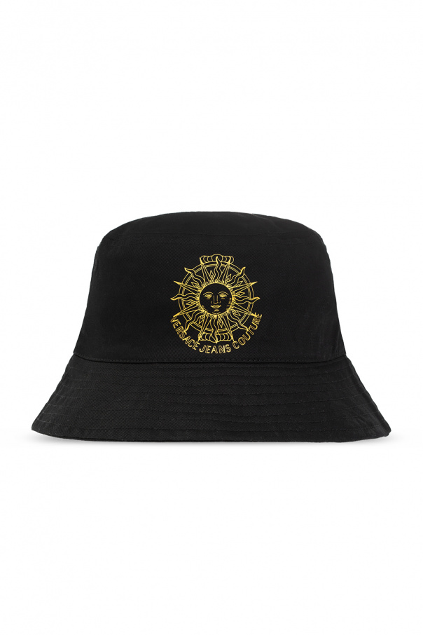 Black bucket hat from Versace Jeans Couture. Made of cotton, this item is decorated with a gold-tone logo print.