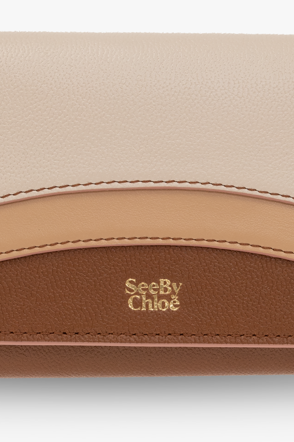 Brown, beige and cream ‘Layers’ wallet from See By Chloe. Made of leather, this item fastens with a snap and is decorated with a logo print and metal hardware in gold-tone. It has two bill compartments, a zipped coin pocket, slip pocket and twelve card slots inside.