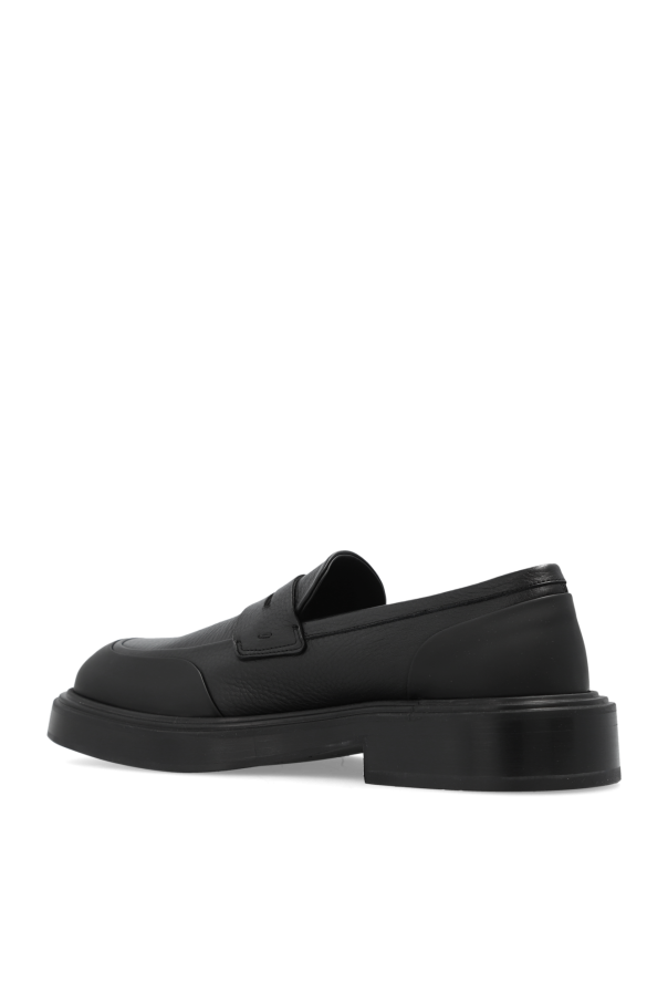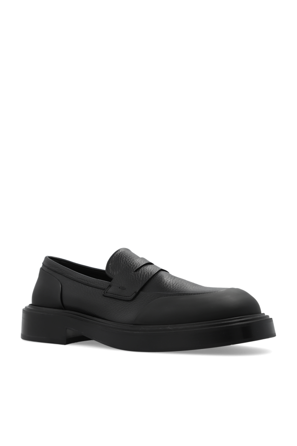 Black ‘Dry’ loafers from FERRAGAMO. Made of textured calf leather, this model sits on a black rubber sole and showcases a frontal strap with a distinctive opening and black rubber inserts on the front and back. Medium-width insole.