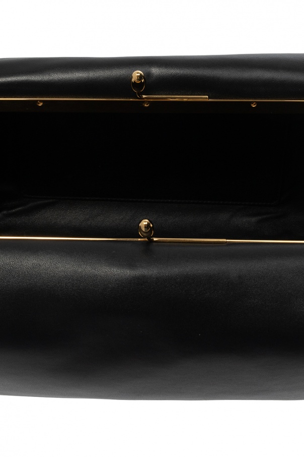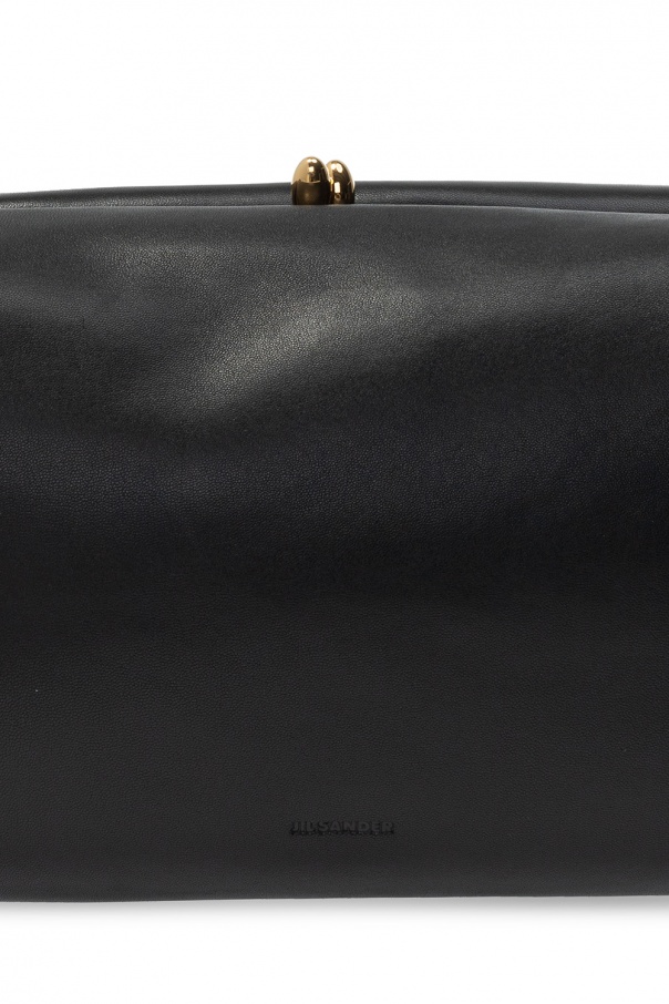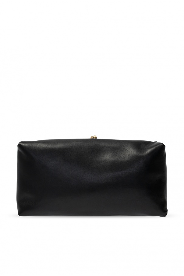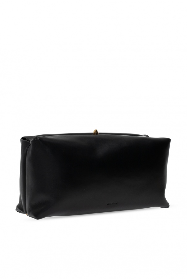 Black clutch from Jil Sander. Embossed with the designer's logo, this item fastens via snap-button and features interior with one compartment and one slip pocket.