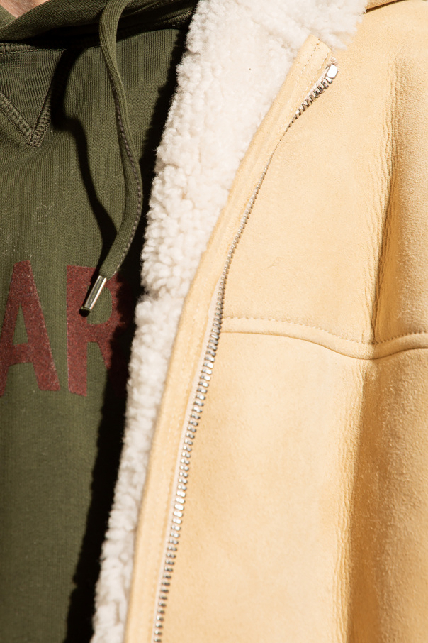 Light beige hooded shearling jacket from Dsquared2. Made of lamb leather with fur trims, this long sleeve design has two-way zip fastening and two slip pockets.