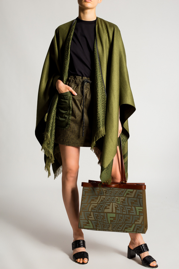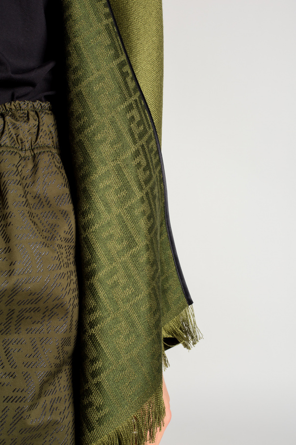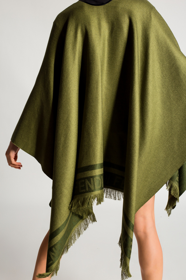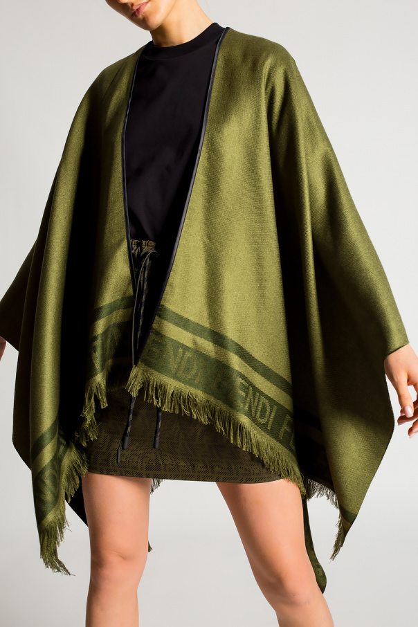 Green poncho from Fendi. Made of a silk and cashmere blend, this design features a logo pattern and fringes.