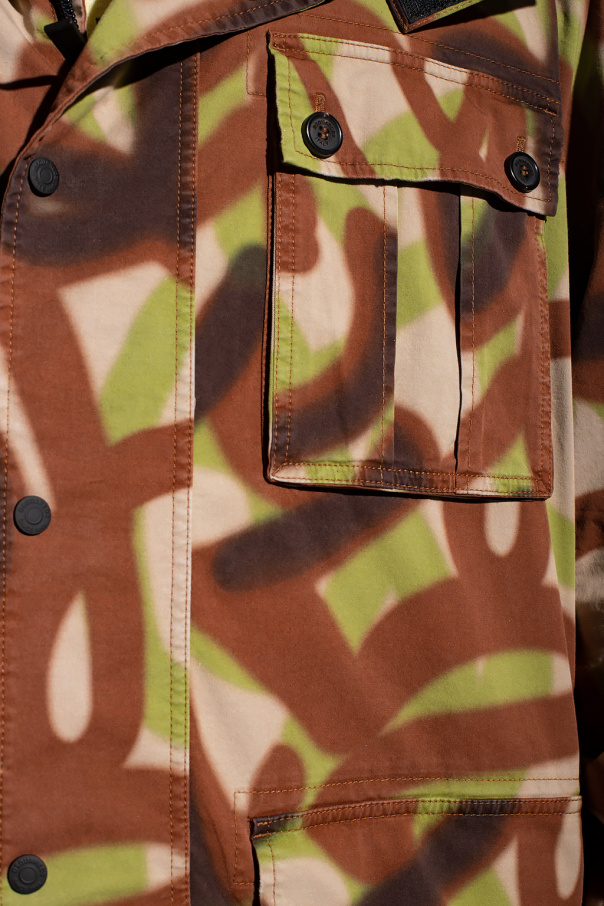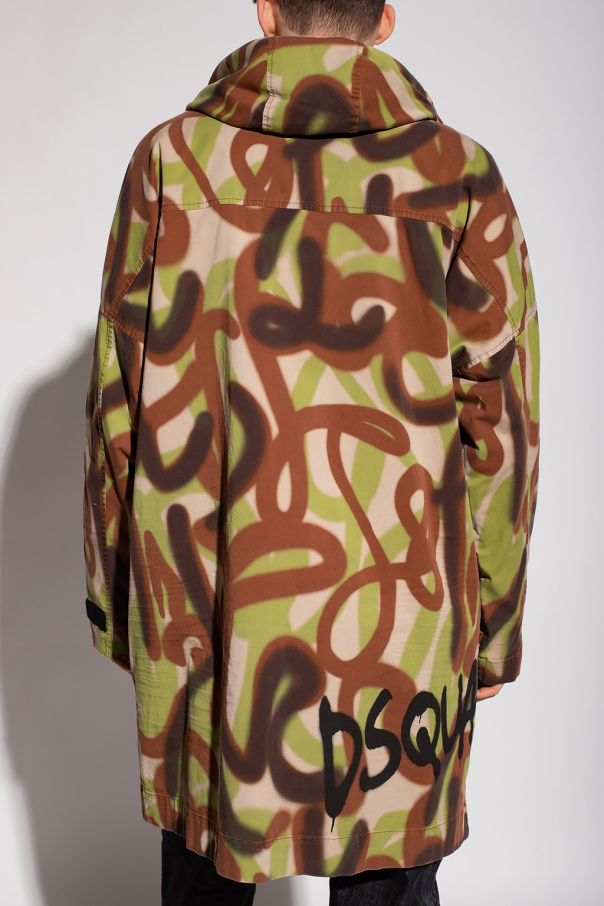 Beige, brown and green cotton hooded parka from Dsquared2. Fastened with snaps and two-way zipper. Stand-up collar with velcro closure. Decorated with a camo pattern. Printed black logo on the side. Hood with drawstrings. Four pockets: three with button flaps and a zipper. Long sleeves finished with Velcro cuffs.
