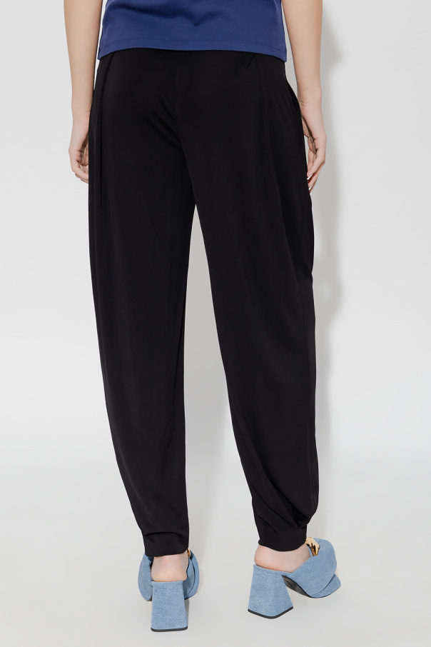 Black trousers from Loewe. Crafted with a relaxed fit, this pair falls with tapered legs and features a drawstring waist, satin trims, pleats and two side seam pockets.