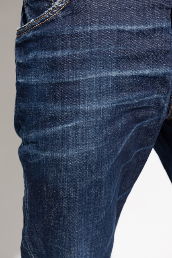 Navy blue ‘Classic Kenny’ skinny jeans from Dsquared2. Falling with tapered legs, this pair features button fastenings, distressed detailing and colourful logo patches on the front and back.
