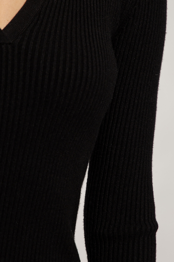 Black ‘Luna’ dress from Samsoe Samsoe. Crafted from a ribbed fabric blend, this style features a V-neckline with a collar, long sleeves and side slits on the bottom hem.
